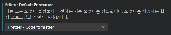 2. 이후 같은 창에서 'Default formatter'를 검색해서 Prettier로 지정해주어야 한다. 처음 Vs Code를 깔았다면 null 없음으로 되어있는 경우가 흔한 것 같다.