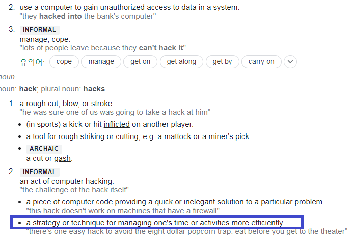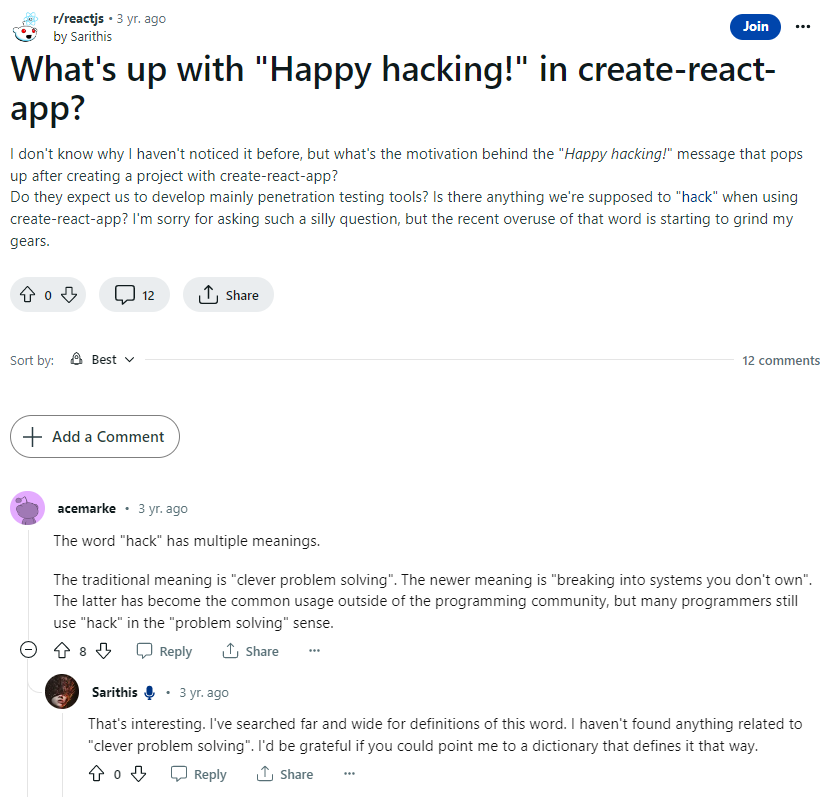 hack이라는 단어에 중복되는 의미가 있다. hack의 전통적인 의미는 '명석하게 문제를 해결하다'이며, 새로 덧붙여진 최신 의미는 흔히 쓰이는 그 해킹이라고 하고 있습니다. 그러나 여전히 많은 프로그래머들은 hack을 문제를 해결하다와 동일한 의미로 두고 쓰고 있다고 합니다. 즉, 리액트에서도 '즐겁고 멋지게 문제를 해결하세요!'라는 의미로 썼다는 뜻이네요.