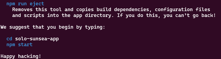 흔히 npm으로 리액트를 깔기 위해서는 위와 같은 명령어를 씁니다. yarn으로 까는 방법도 소개하던데 일단 익숙한 방식을 사용해보기로 합니다. 그러면 한참 설치를 위한 무언가 돌아가다가 마지막에는 아래와 같은 문구가 나옵니다.
