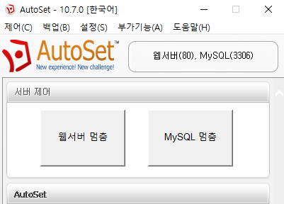 1. AutoSet을 다운 받아서 바로 실행시킨다. 처음에 버튼에 '멈춤'이라고 떠있어야 서버가 구동 중인 것이다.